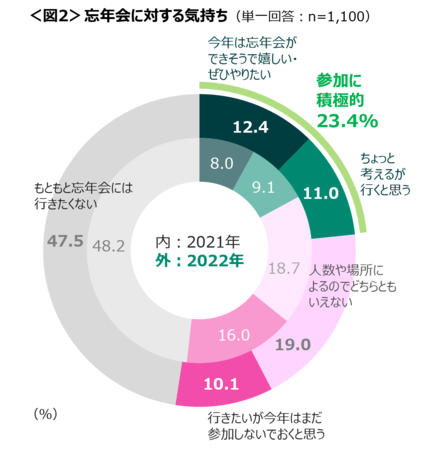 半数近くは「もともと忘年会に行きたくない」と消極的。一方、「ぜひやりたい」+「行くと思う」は23.4%と昨年より6.3ポイント増加。 <図2>