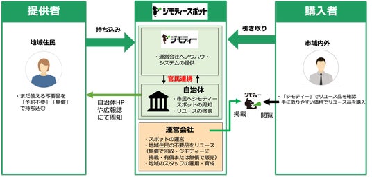 ジモティースポットは、「不要になったけれどもまだ使えるモノ」を地域のコミュニティ内で譲り合うことが出来るサービスです。持ち込み希望の方は、ジモティースポットに持ち込むだけで、手軽に必要とする人に譲渡することができます。そして、譲り受け希望の方は、持ち込まれたモノの情報を地域の情報サイト「ジモティー」で検索し、ジモティースポットで引き取ることでマッチングが成立する仕組みとなっています。
