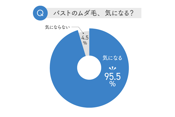 はじめに、バストのムダ毛が気になるかどうか聞きました。なんと95%以上の方が「気になる」と回答し、実は気にしている女性が多いことが判明しました。