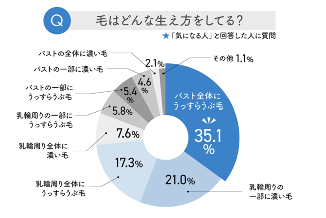 「気になる」と回答した方に、どんな生え方をしているかも聞くと、最も多かった回答は「バスト全体にうっすらうぶ毛が生えている状態(35.1%)」でした。次いで「乳輪周りの一部に濃い毛が生えている(21%)」、「乳輪周り全体にうっすらうぶ毛が生えている(17.3%)」、「乳輪周り全体に濃い毛が生えている(7.6%)」と続き、バストのムダ毛が気になる部分は、“乳輪周りのムダ毛”の可能性が高いことが分かりました。