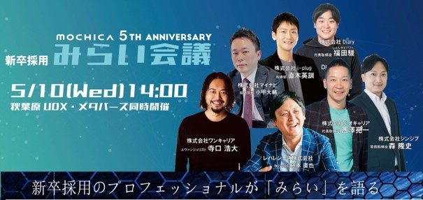 当社が展開する、採用活動の入口である母集団形成からゴールの採用まで一気通貫で利用できる採用管理・コミュニケーションツール「MOCHICA」は、サービス提供開始5周年を迎え、導入社数が855社となりました。これを記念し、当社はこれからの新卒採用活動で効果的な母集団形成から採用までの施策を1日で学ぶことができる企業向けイベント「新卒採用みらい会議」を、HR業界のトップランナーを招いて2023年5月10日(水)にオフライン・メタバースで同時開催します。