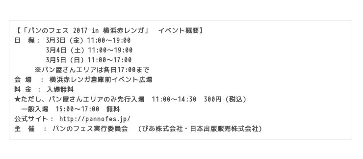 ぴあ株式会社(本社:東京都渋谷区東、代表取締役社長:矢内廣)は、出版取次の日本出版販売株式会社(本社:東京都千代田区神田駿河台)と共同で、2017年3月3日(金)~5日(日)の3日間、横浜赤レンガ倉庫前イベント広場にて「パンのフェス2017 in 横浜赤レンガ」(http://pannofes.jp/) を開催します。