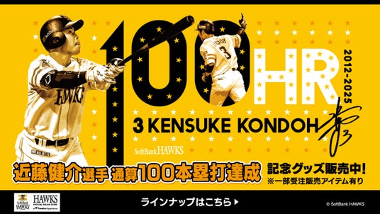 近藤健介選手が7月8日(火)のオリックス・バファローズ戦で、通算100本塁打を達成しました。これを記念したグッズをHAWKS STORE及びホークス公式オンラインストアで販売いたします。