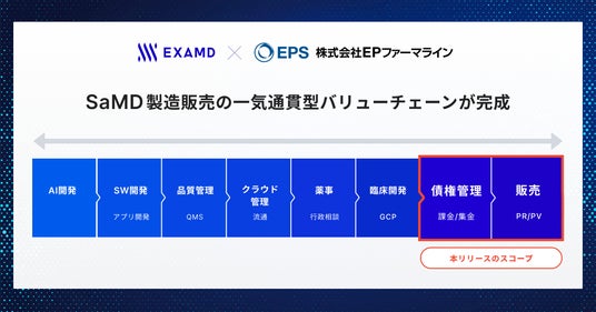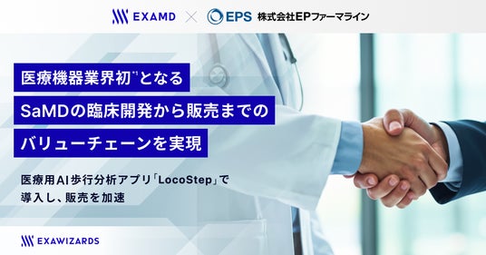 株式会社エクサウィザーズ(東京都港区、代表取締役社長CEO:春田 真)のグループ会社で、健康・医療分野に特化したAIサービスを開発・提供する株式会社ExaMD(東京都港区、代表取締役:羽間 康至、以下ExaMD)は、株式会社EPNextS傘下株式会社EPファーマライン(東京都豊島区、代表取締役社長:伊勢 由多可、以下EPPL)とSaMD (ソフトウェア医療機器)の販売に関する業務提携契約を締結しました。本提携により、ExaMDが開発したSaMDの販売から債権管理までのバリューチェーンが完成します。