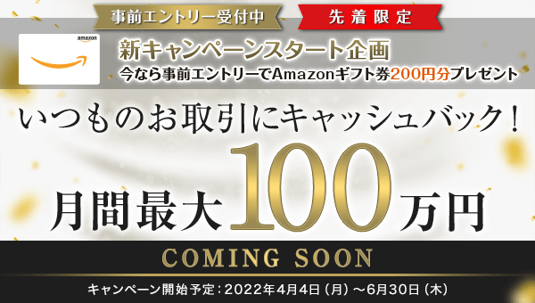 外貨ex byGMO株式会社(本社:東京都千代田区、代表取締役社長:松本好史)は、2022年4月4日(月)より新たなキャッシュバックキャンペーンを実施します。また新キャンペーンのスタートを記念して、本日2022年2月22日(火)より、事前エントリーで先着1万名さまにAmazonギフト券をプレゼントする企画を実施します。