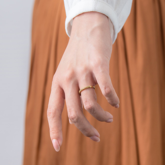 POMPOMPURINをサイドにデザインした、シンプルなハーフエタニティリング。POMPOMPURINをイメージしたカラーに合わせてシトリンを留めました。キャラクター同様、あなたの持つ魅力や色を大切にしてほしいと、願いを込めて。
