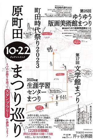 また、10月22日限定で4つのお祭りを巡り、各お祭りのブースで特製缶バッジがもらえるスタンプラリー「原町田まつり巡り」を行います。スタンプカードは、町田ツーリストギャラリー、町田市民文学館、生涯学習センター及び国際版画美術館にて配布しています。