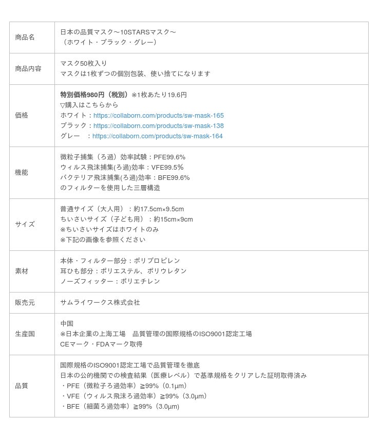 サムライワークス株式会社(代表取締役社長:新島 実 本社所在地:東京都渋谷区)は、10都府県で緊急事態宣言の延長が決定し、より多くの皆様に高品質のマスクをご使用頂けるよう、『日本の品質マスク~10STARSマスク~』を追加販売することを決定いたしました。販売価格はなんと980円(税別)!1枚当たり19.6円と非常にお安くなっております。