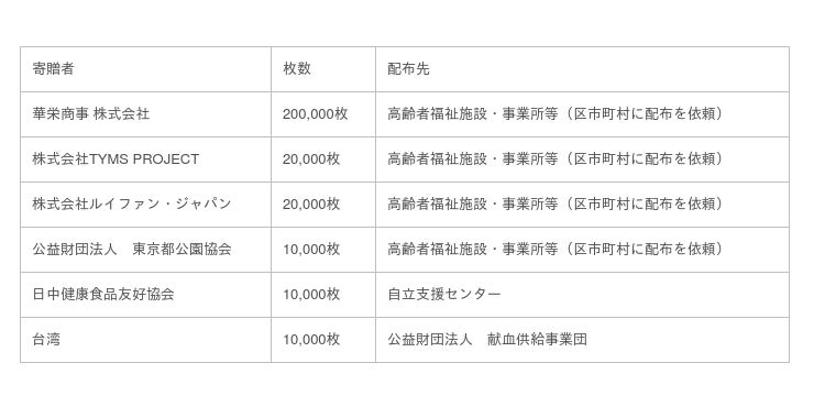 2020-05-20 東京都 マスクの寄贈及び配布について Tweet ~新型コロナウイルスに関する東京都からのお知らせ~ この度、東京都にマスクの寄贈が6件あり、下記のとおり配布しましたので、お知らせします。 [表: https://prtimes.jp/data/corp/52467/table/377_1.jpg ] 企業プレスリリース詳細へ PR TIMESトップへ 公式ツイッター Follow @Straightpress 最新情報をTwitterで受け取ろう! 公式フェイスブックページ 最新情報をFacebookで受け取ろう! 前の記事 一覧へ戻る 次の記事
