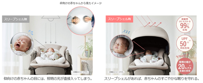 大型幌のスリープシェルで夜をつくり、いつでもどこでも赤ちゃんのすこやかな眠りの環境をつくる!