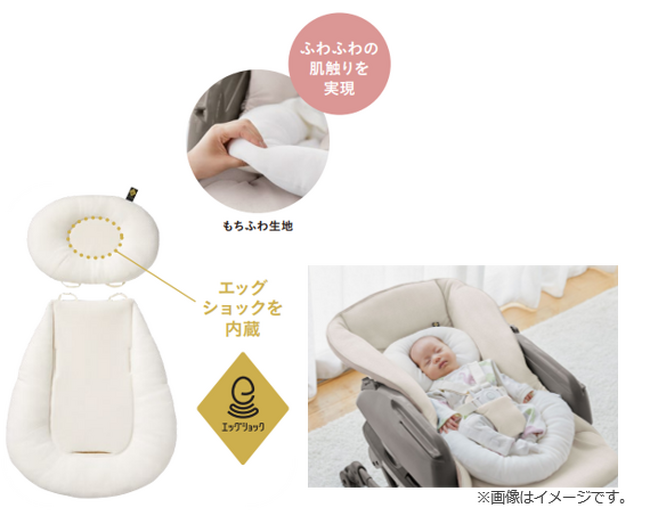 頭部には、超・衝撃吸収素材「エッグショック」を搭載し、赤ちゃんをやさしく包み込みます。