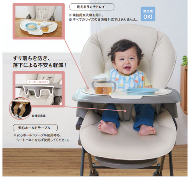 また、ハイチェアとしても利用でき、赤ちゃんのからだを支えることができる形状のテーブルで、ずり落ちを防ぎ