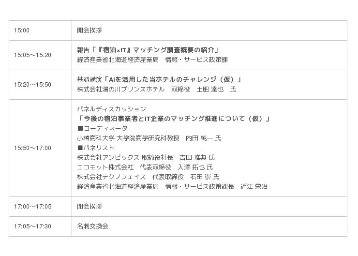 本シンポジウムでは、道内宿泊事業者のIT活用による生産性向上に向けた動き及びIT企業の技術の導入可能性について紹介するとともに、宿泊事業者とIT事業者のマッチングに向けた課題や行政による支援策のあり方について、関係識者による意見交換から明らかにしていくことを目的として開催するものです。