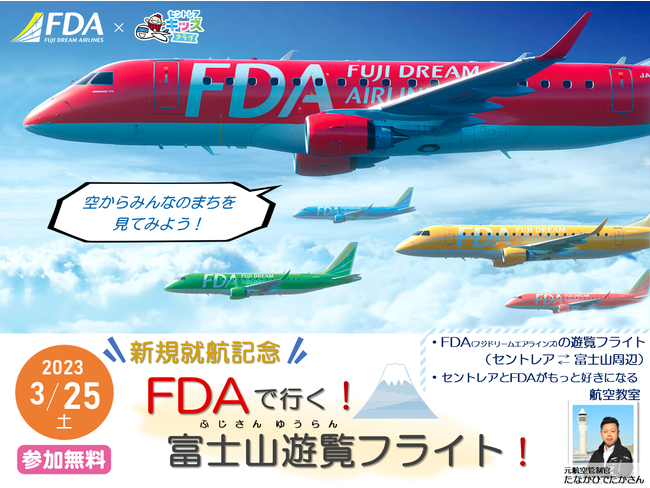 中部国際空港セントレア(所在地:愛知県常滑市)では、2023年3月26日より、セントレア~高知線をフジドリームエアラインズ(以下FDA)が新規就航することを記念して、FDAが主催する富士山遊覧フライトへセントレアキッズクラブをご招待します。普段の旅行では味わうことのできない特別フライトと元航空管制官の田中秀和さんによる航空教室を開催します!ぜひ親子でご参加ください。