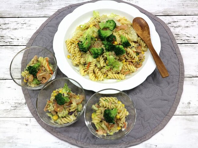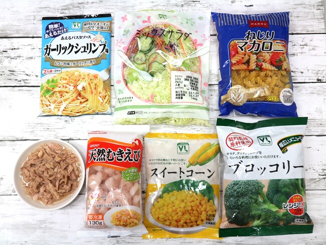 一口目から、パンチのあるガーリックの風味が広がり、一瞬で食欲全開になるこのメニュー。パスタソースがオイル状なので、サッと具材に混ざり調理もラクラク!『ねじりマカロニ』への絡みも抜群です。カット野菜の『VLミックスサラダ』を一緒に合せることで、色々な野菜を一度に摂取できるのもうれしいですよね。超新感覚のマカロニサラダを、ぜひともお試しください。