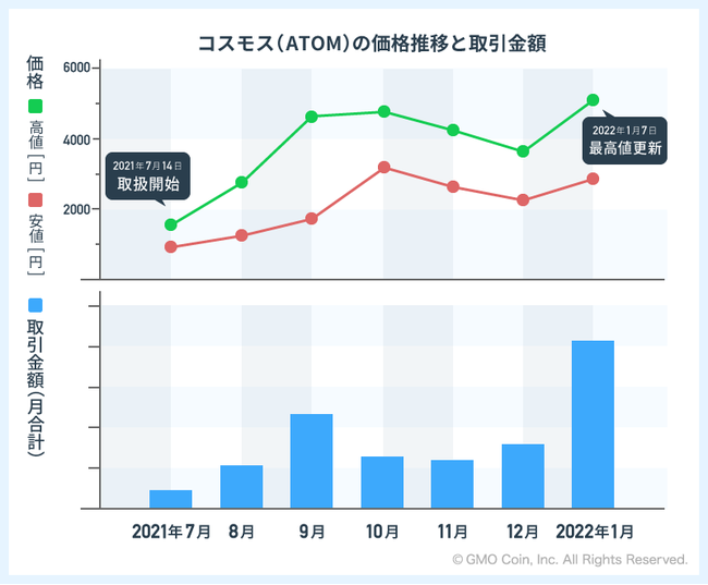 GMOコインでは2021年7月14日よりコスモス(ATOM)の取り扱いを開始しました。その後コスモス(ATOM)の価格は上昇し、2022年1月に史上最高値を更新しました。