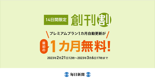 毎日新聞社(代表取締役社長執行役員:松木健)は2月21日の毎日新聞創刊日を記念して、ニュース配信サービス「毎日新聞デジタル」 でプレミアムプラン「1カ月自動更新」が最初の1カ月無料になる「創刊割」キャンペーンを開始しました。14日間限定のお得なキャンペーンになります。ぜひこの機会にご利用ください。
