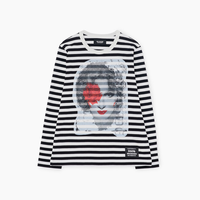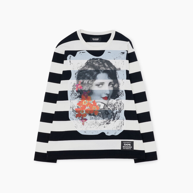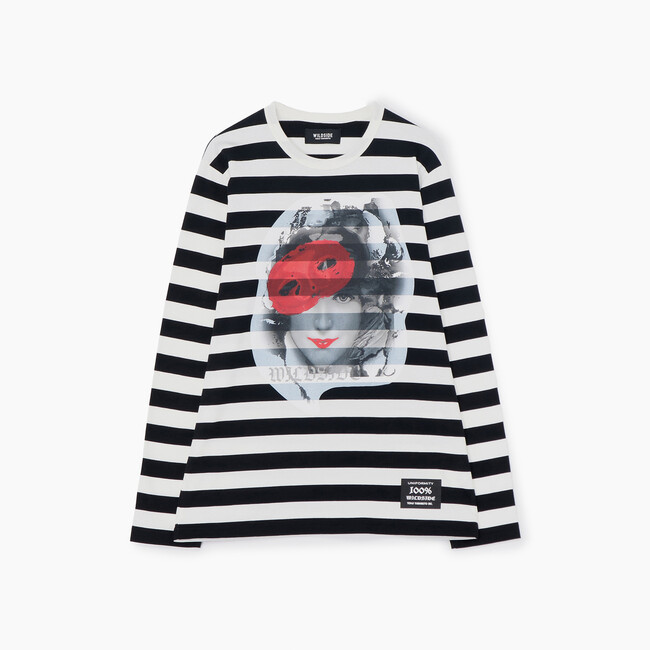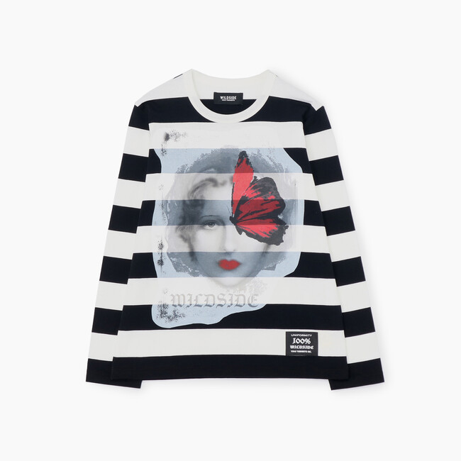 新たに登場するのは、ピッチの異なる3種のボーダー柄のボディーに、それぞれ異なるアートワークを、フロントに大胆にプリントしたカットソーシリーズ。魅惑的な眼差しを向ける女性の顔に、表情を隠すかのように蝶、薔薇、アイマスク、花をあしらったアートワークは、ボーダー地が透けて見えるほどの透明度でプリントする事で、更に妖艶な雰囲気を醸し出しています。コラージュのように白い縁取りを施したグラフィックはインパクトがあるため、一枚ではもちろん、ジャケットやブルゾンのインナーとしてもおすすめです。