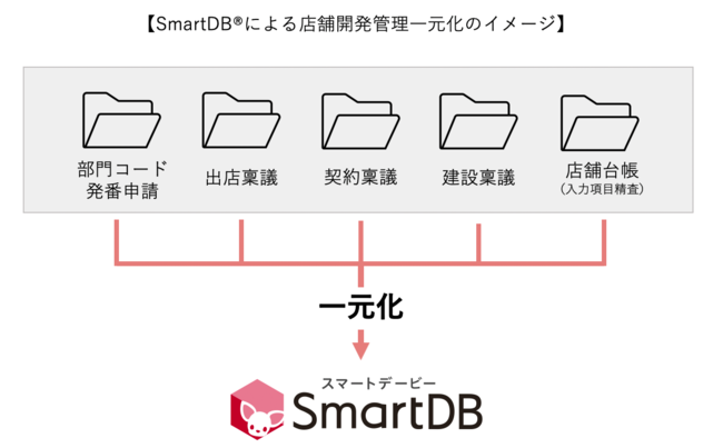 SmartDB(R)︎導入により、店舗開発管理において年間7,000件にのぼる書類のデジタル化と一元管理を目指します。結果として工程管理にかかる工数だけでも年間1,300時間の削減を見込んでいます。また店舗開発における作業工数や工事費用、それに関連する申請の情報が一元化されることで、集計作業も効率化することができます。