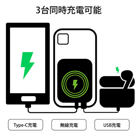 ・TypeC充電、無線充電、USB充電で最大3台同時に充電可能。