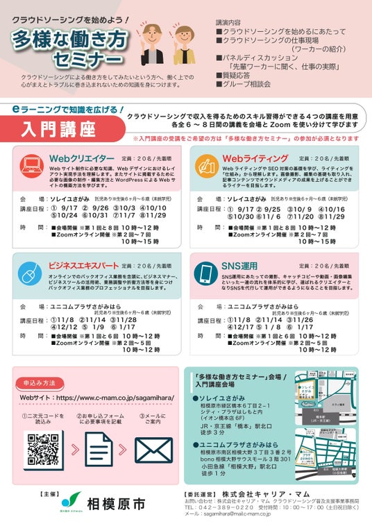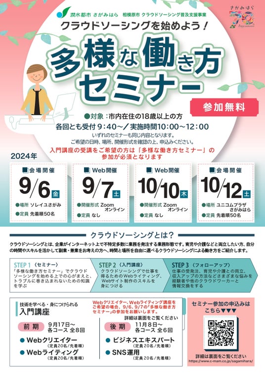 この度、「相模原市総合計画推進プログラム」における重点テーマの一つである「雇用促進対策」の強化を図るための取組として、市内在住の18歳以上の方を対象に、多様な働き方を可能にするクラウドソーシングについて学ぶことができるセミナーを開催します。