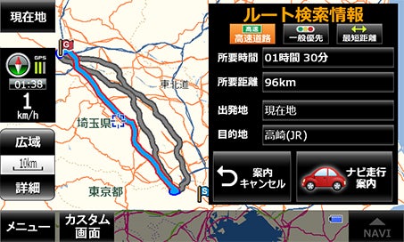 ルート検索時に一般道優先・高速優先・最短距離の3ルートを同時に検索可能。