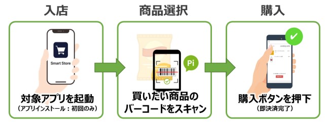 ・スマートフォンのみで商品選択、決済までが完結する、密接・密集を避けた非接触の購買