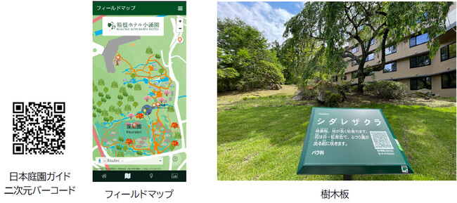 自然あふれ、ゆっくり散策することができる庭園の魅力を皆様にお伝え するため、散策路各所に「樹木板」を設置し、二次元バードコードをお客様ご自身のスマートフォンで読み込んでいただくと草木の説明がご覧いただけ ます。庭園をみるだけでなく、知識として新たな発見ができるようにいたし ました。またフィールドマップもご用意しており、全体感や見どころ、フォトギャラリーがご覧いただけます。フォトギャラリーは 今後順次季節の美しい庭園をアップしてまいりますのでご期待ください。