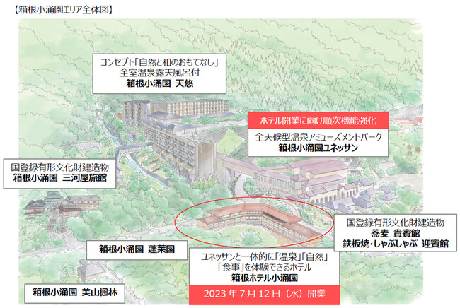 日帰り温泉施設「箱根小涌園ユネッサン」を中心に、その周りにある3つの宿泊施設(箱根小涌園 天悠、 箱根小涌園 三河屋旅館、箱根小涌園 美山楓林)と2つのレストラン(蕎麦 貴賓館、鉄板焼・しゃぶしゃぶ 迎賓館)からなるエリアの総称。箱根小涌園の始まりは、1948年、9室の旅館「箱根小涌園(現:蕎麦 貴賓館)」の開業がルーツであり、藤田観光グループ発祥の地。2023年7月開業の「箱根ホテル小涌園」はエリア4つ目のホテルとなります。