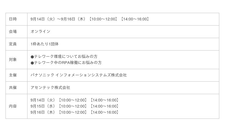 パナソニック インフォメーションシステムズ株式会社は、2021年9月14日(火)~16日(木)の3日間、「遠隔RPA」「簡単テレワーク」2通りの使い方ができる「リモートPCアレイ」のオンライン見学会を開催します。