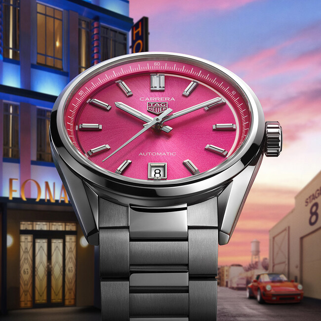 有名な数字、そして伝説の人物がちらっと顔を出すなど、タグ・ホイヤー カレラの豊かな歴史へのオマージュやヒントがこのショートフィルムには隠されています。 映画の中で必死にカレラを取り戻そうとしているのはプロップマスターかもしれませんが、実際のところ、タグ・ホイヤーの最もアイコニックなクロノグラフは決して映画の小道具(プロップ)ではありません。ブランドアンバサダーのライアン・ゴズリングと並んで、この映画の主役なのです。 映画のワンシーンでは、監督役を演じるリーチ監督が言います。「はいそこでライトに向かって時計を傾けて!」 ゴズリングが絶対に手から外さないカレラは、新しいタグ・ホイヤー カレラ クロノグラフです。ダイヤルエッジの周りにあるタキメータースケールとケースをぴったりと沿って覆うドーム型サファイアクリスタルである「グラスボックス」が採用されたこのウォッチには、非常に美しい特徴的なブルー文字盤に、ブルーのカーフレザーストラップが使われています。このアイコン的存在がこれほどモダンに見えたことはないでしょう。ゴズリングが簡単には手渡したくない理由もわかります。断固として譲らない姿勢に値するタイムピースです。一方、ベイヤー扮するプロップマスターは、ピンクカラーの新作タグ・ホイヤー カレラ デイトを着けています。