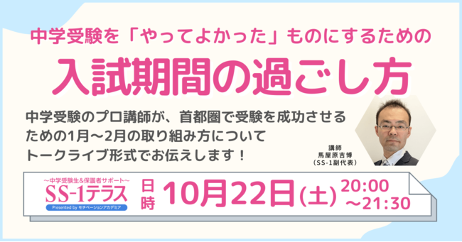 中学受験 個別指導のSS-1が運営するオンラインサービス「SS-1テラス」では、2022年10月22日(土)に中学受験を目指すお子さんを持つ保護者様向けトークライブ【中学受験を「やってよかった」ものにするための入試期間の過ごし方】を開催いたします。