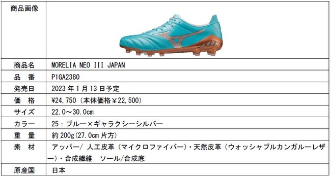 ミズノは、サッカー日本代表が国際大会で着用予定のトップモデルのサッカーシューズ3種の限定カラー「AZURE BLUE PACK(アジュール ブルー パック)」を12月16日から順次、全国のミズノ品取扱店で販売します。