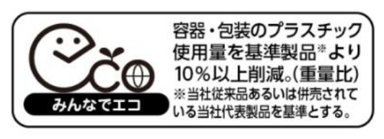 従来品の「クルマの消臭力 シート下専用200g」に比べ、プラキャップを無くし、プラスチックから紙のパッケージに変更、さらに、天面シールを廃止しています。これによって、“容器・包装のプラスチック使用量を基準製品(※)より10%以上削減(重量比)”というエステー独自の環境配慮基準を満たすことから“みんなでエコ”マーク(下)を表示しています。
