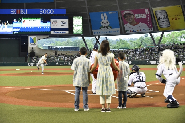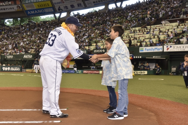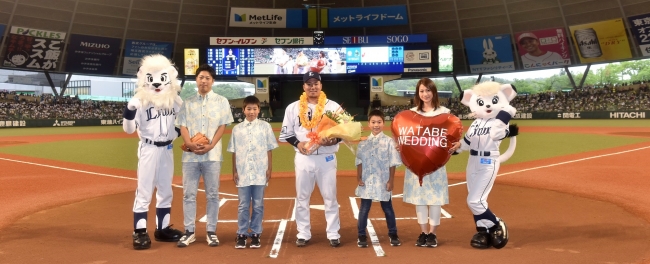 当日は、球場にいながらリゾ婚気分が味わえる『ワタベウェディング リゾ婚Day』特設ブースにて、2018年12月にハワイの「ラニレア チャペル」で挙式を行った山川穂高選手がタキシードを着用している等身大写真との記念撮影や、実際に着用された挙式衣裳などの展示が人気を集めました。さらに、試合前にはワタベウェディングでリゾ婚をされるご予定の松岡様ご夫妻とお子様2名が、ご家族全員お揃いのアロハシャツで始球式に登場し、お子様2名が憧れのプロ野球選手に花束とレイの贈呈を行いました。さらに、少年野球チームのコーチも務めるご新郎様が始球式を行い、終了後「この度は貴重な機会をいただけて大変感謝しております。一生の思い出になりました。」と始球式を振り返りました。