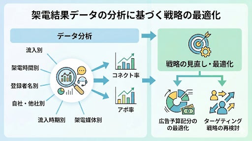- 流入別・架電時間別・登録者属性別・自社他社別・流入時期別・架電媒体別の多角的データ分析