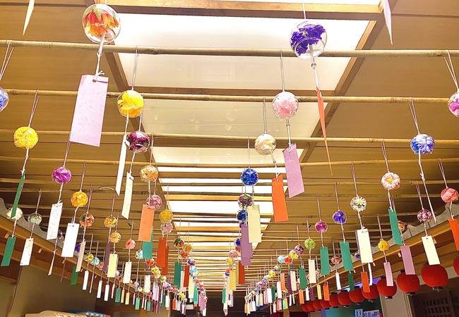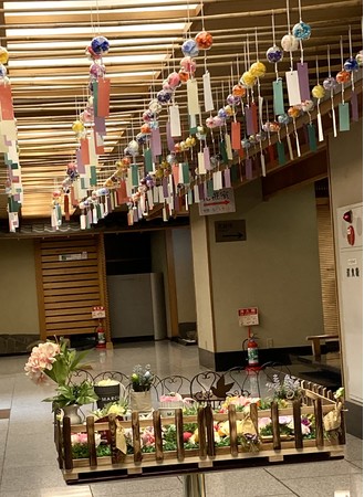 夏らしい風鈴と和の雰囲気漂う番傘を館内に設置いたしました。