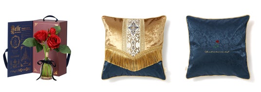 大切なだれかとお揃いで使えるペアスローです。スローを収納するポーチは、金糸入りのフリンジタッセルのチャームが付いており、『美女と野獣』の物語の煌びやかなイメージを表現しています。フランネル生地のスローの端には、物語を象徴するモチーフが箔プリントで施されており、繋がるデザインになっています。