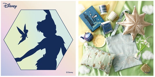 「ティンカー・ベル」のくびれのあるスタイルや、羽の形状をデザインに落とし込んだペアマグです。マグ本体の柄は「ピーター・パン」と「ティンカー・ベル」の象徴的なモチーフをポップな印象のテキスタイルで表現しています。