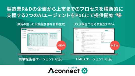 本アップデートにより、「Aconnect」は従来の情報収集・技術探索・特許調査の枠を超え、製造業R&Dにおける企画から上市までの一連のプロセスを横断的に支援することが可能になります。属人化しがちな実験結果の整理・報告業務や、形骸化しやすいリスク検討(FMEA)を実務として再実装し、組織的なナレッジ循環を加速させます。