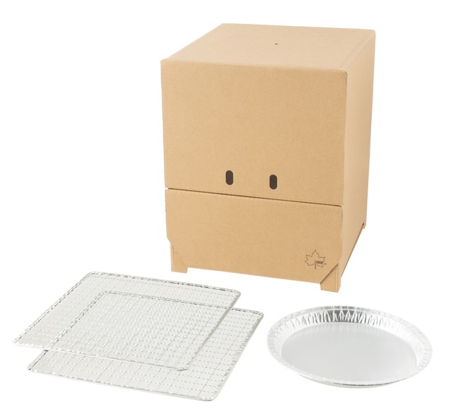 本アイテムは、2枚の網をセットできる2段式構造のスモーカーです。最下段にはアルミ皿に載せたスモークウッド(別売)を置くため、下段ほど香りが強くなり、食材やお好みに合わせた薫製料理を作ることができます。上部の食材部分と下部の燃焼部分にはそれぞれ前開きでフルオープン可能な扉があるので、食材の出し入れや内部の確認がしやすく、作業性も抜群です。本体は天面に1箇所、底面に4箇所の空気穴があることで、空気の流れ道ができるので、スモークウッドの火が消えにくく、長時間調理にも対応します。また本体のデザインは、正面の扉の開閉により、ワクワクとウキウキ2つの表情になるフェイスデザインになっており、調理時間も楽しむことができます。さらに、本体は段ボールでできているため、折って組立てるだけで簡単に準備でき、調理後は破って分解できるので後処理もラクラクです。
