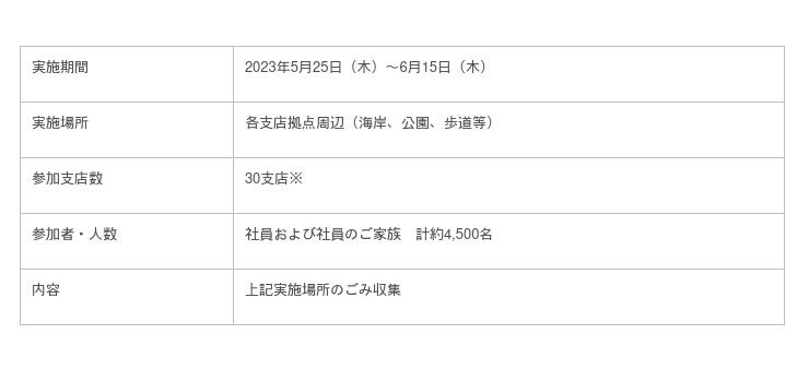 本活動は、NTT西日本グループのサステナビリティ活動の一環として、地域への貢献や社会貢献意識の醸成等を目的に、5月30日「ごみゼロの日」、6月5日「環境の日」、6月8日「世界海洋デー」の3つの記念日を含む2023年5月25日(木)~6月15日(木)の期間に西日本エリアの各支店がそれぞれの拠点周辺の清掃を行ったものです。