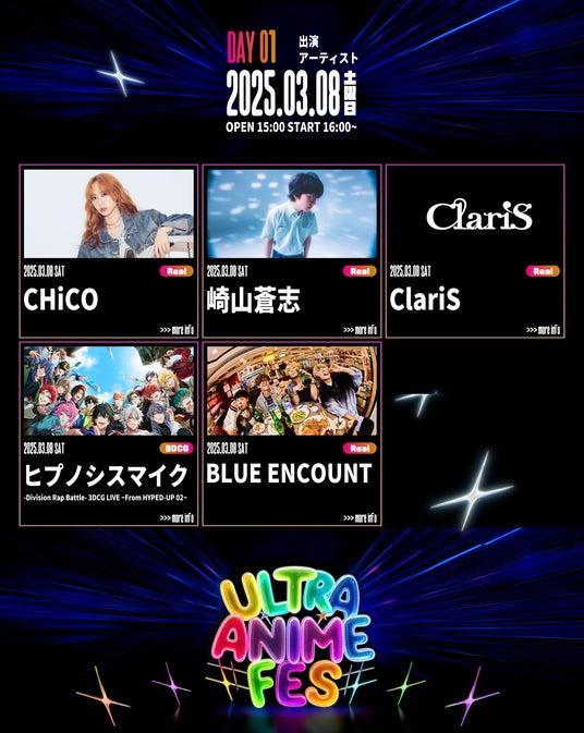 3月8日出演アーティスト:ClariS、崎山蒼志、CHiCO、BLUE ENCOUNT、ヒプノシスマイク -Division Rap Battle- 3DCG LIVE ~From HYPED-UP 02~【3DCG LIVE】