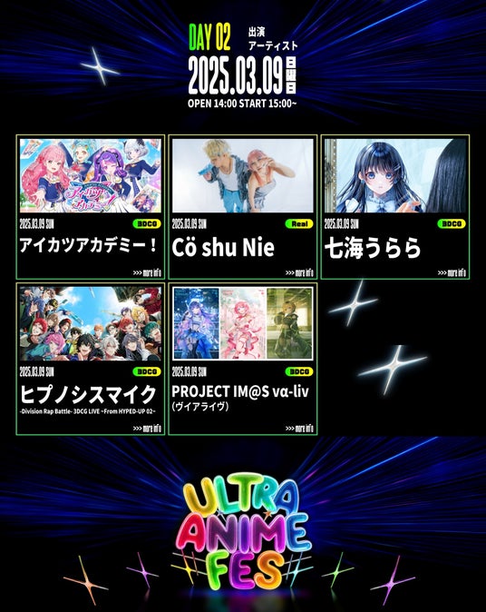 3月9日出演アーティスト:アイカツアカデミー! 【3DCG LIVE】、Co shu Nie、七海うらら 【3DCG LIVE】、PROJECT IM@S vα-liv(ヴイアライヴ)【3DCG LIVE】 、ヒプノシスマイク -Division Rap Battle- 3DCG LIVE ~From HYPED-UP 02~ 【3DCG LIVE】