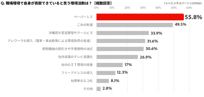 続いて、ビジネスパーソン自身が「貢献できていると思う環境活動」について尋ねたところ、半数以上の55.8%が「ペーパーレス」と回答しました。ペーパーレスはビジネスパーソンにとって、最も取り掛かりやすい環境活動であることが分かります。