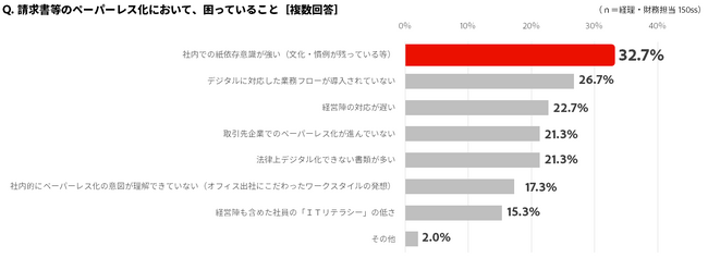 次に、請求書などの経理業務のペーパーレス化に関して困っていることを尋ねると、「社内での紙依存意識が強い(文化・慣例が残っているなど)」が最多で、3割超の方から回答がありました。経理・財務担当者を困らせているのは、システム面などでの課題以上に、会社の文化面での課題のほうが大きい傾向が明らかになりました。