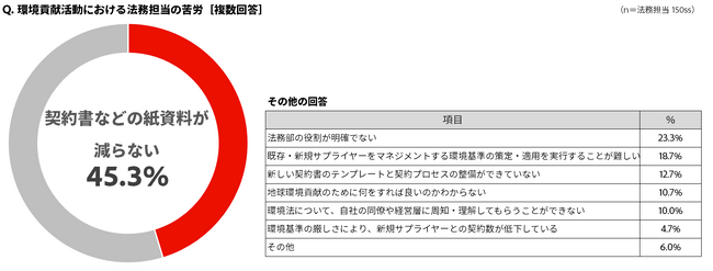 法務担当(150名)に環境貢献活動における法務担当の苦労している点を尋ねたところ、「契約書などの紙資料が減らない」が45.3%で、他の回答から20ポイントの差をつけてトップの回答となりました。公的な文書を残すために、まだまだ紙資料の存在は必要なものだと考えられているようです。