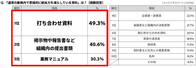 ペーパーレスの内容をみると、意識的に紙出力を減らしている資料は、上から順に「打ち合わせ資料(49.3%)」、「掲示物や報告書など組織内の提出資料(40.6%)」、「業務マニュアル(30.3%)」と続きました。