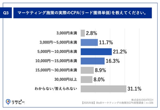 「Q3.マーケティング施策の実際のCPA(リード獲得単価)を教えてください。」(n=326)と質問したところ、「5,000円~10,000円未満」が21.2%、「10,000円~15,000円未満」が16.3%という回答となりました。