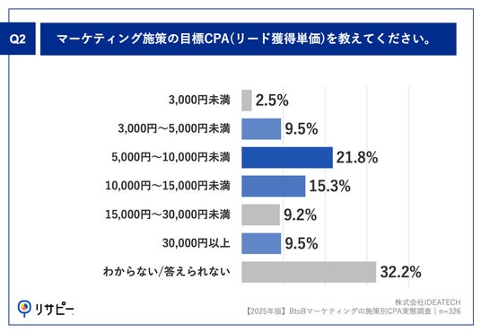 「Q2.マーケティング施策の目標CPA(リード獲得単価)を教えてください。」(n=326)と質問したところ、「5,000円~10,000円未満」が21.8%、「10,000円~15,000円未満」が15.3%という回答となりました。